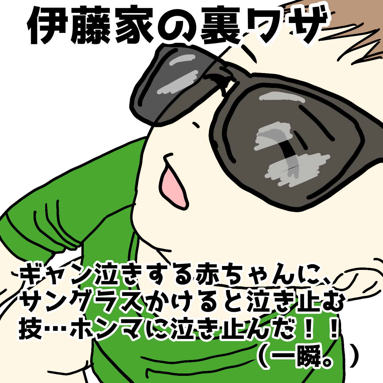 先日、スペシャルで放送されていた「伊藤家の裏ワザ」で紹介されていた方法です。ギャン泣きしている赤ちゃんに、サングラスをかけると泣き止むというものでした。