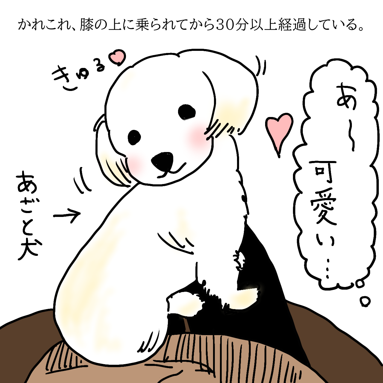 ちなみに、こんな感じでわんこがお膝に乗ってしまうと身動きが取れなくなるので